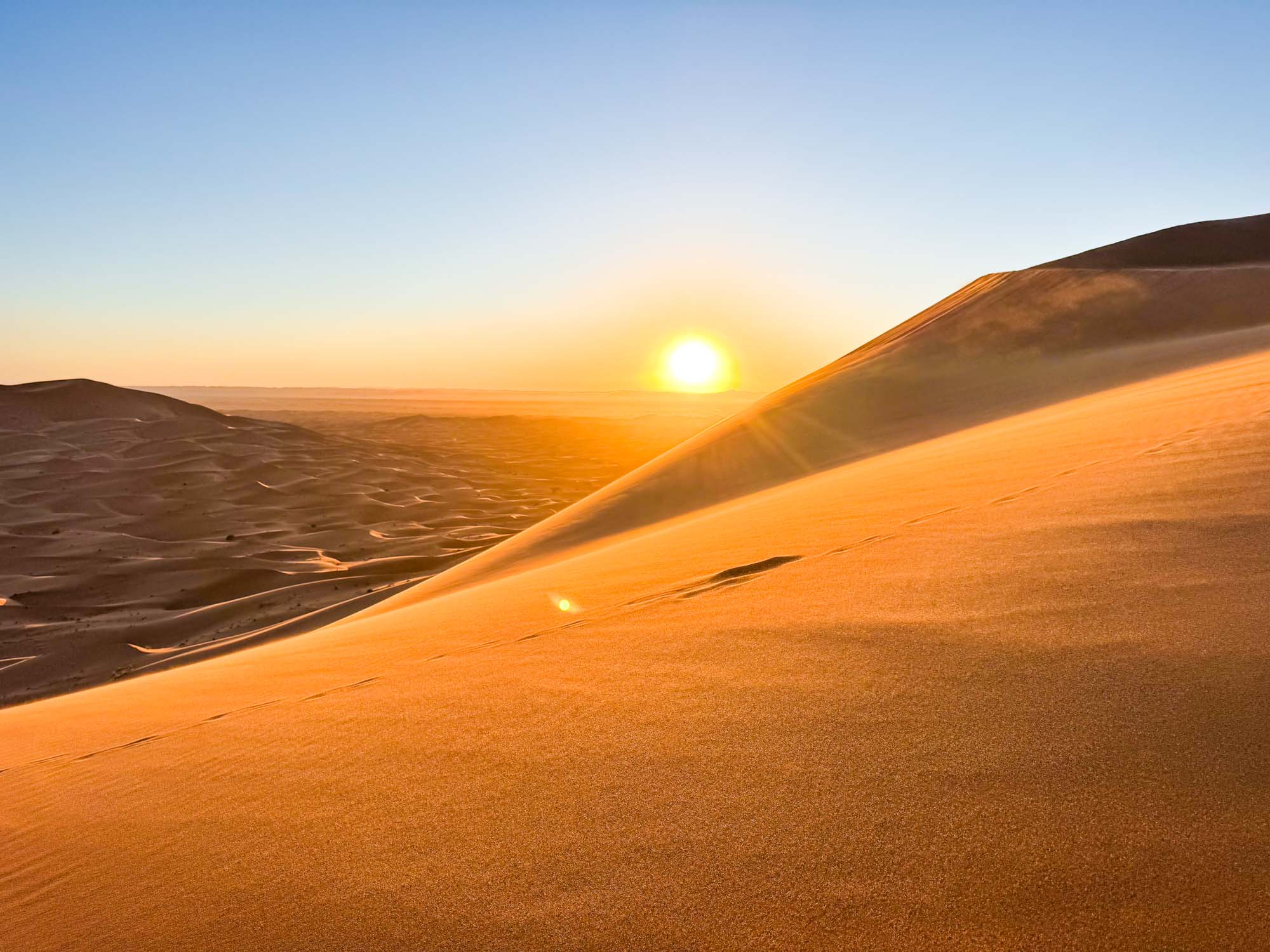 Die Sonne hat selbst Anfang Dezember noch eine kraftvolle Wärme, die die Farben der Dünen im Wechsel der Tageszeit changieren lässt von Gold über Ocker bis Rot.